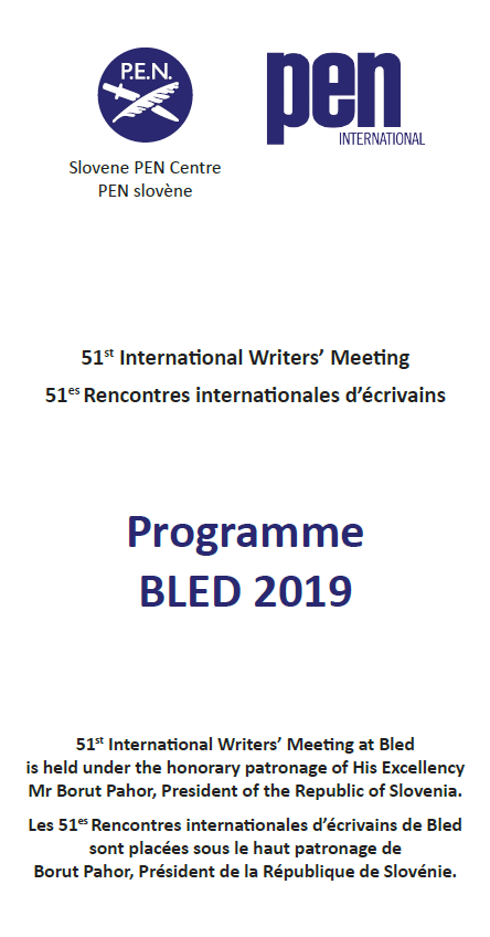 Nous avons le plaisir de vous inviter aux 51es Rencontres internationales de Bled organisées conjointement par le PEN slovène et le Comité pour la Paix de PEN international. Elles auront lieu du 3 au 6 avril 2019 à l'hôtel Park de Bled. Nous avons prévu deux tables rondes: la première intitulée Imagination et réalité : Éveil des jeunes à la littérature est organisée par le PEN slovène et la deuxième Représentation de l’autre : chemin vers la paix ou chemin vers la guerre par le Comité pour la paix de PEN international.